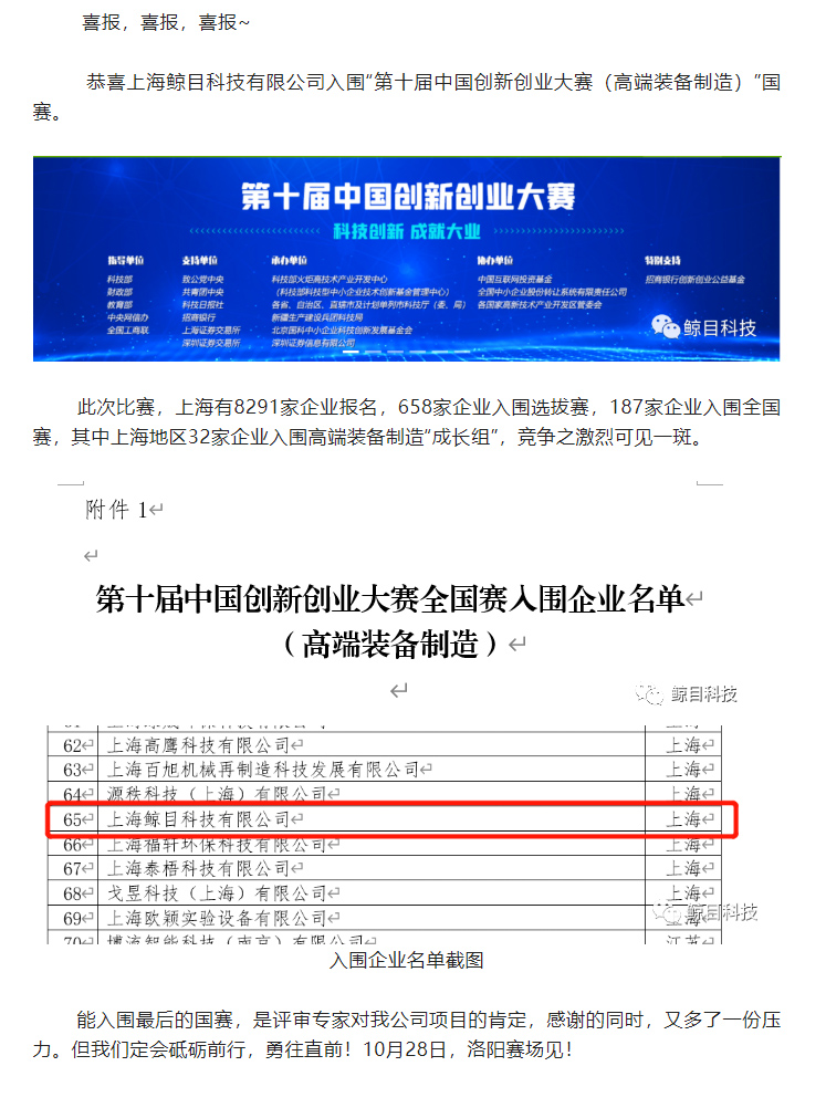 恭喜上海鲸目科技有限公司入围“第十届中国创新创业大赛(高端装备制造)”国赛。此次比赛,上海有8291家企业报名,658家企业入围选拔赛,187家企业入围全国赛,其中上海地区32家企业入围高端装备制造“成长组”,竞争之激烈可见一斑
